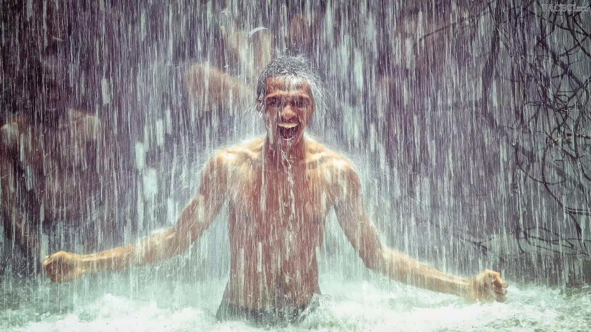 Wodospad, Śmiech, Chłopak, Woda - faceci.biz